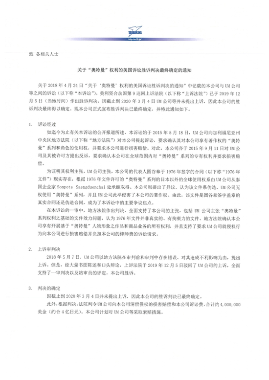 昨日,又有好消息传来。由于截止到2020年3月4日UMC等并未提出上诉,圆谷奥特曼系列争议案件在美强势胜诉!