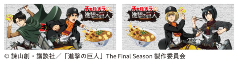 这活动是以纪念《进击的巨人》漫画完结的名义举办的,消费者购买对应的袋装面或者杯面,获得抽奖资格。官方将会送出500条『今治毛巾原创毛巾』。此外5月17日开始,以《进击的巨人》中出现的,以芋头为主材料、配上土豆和肉末的清汤酱油味的特别口味,而且面的包装也是有《进击的巨人》角色出现的。