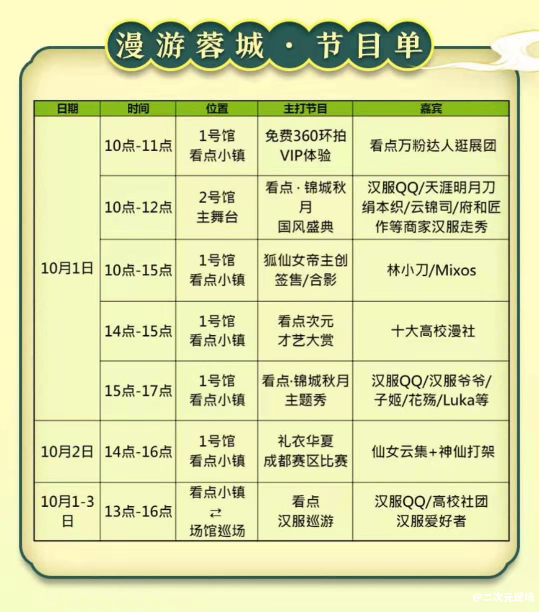 大热国漫《我的狐仙女帝》主创林小刀、Mixos将空降现场开启签售会;十大高校漫社将带来看点次元才艺大赏;汉服QQ、汉服爷爷、子姬、花殇、Luka等达人的“锦城秋月”主题秀也备受期待。
