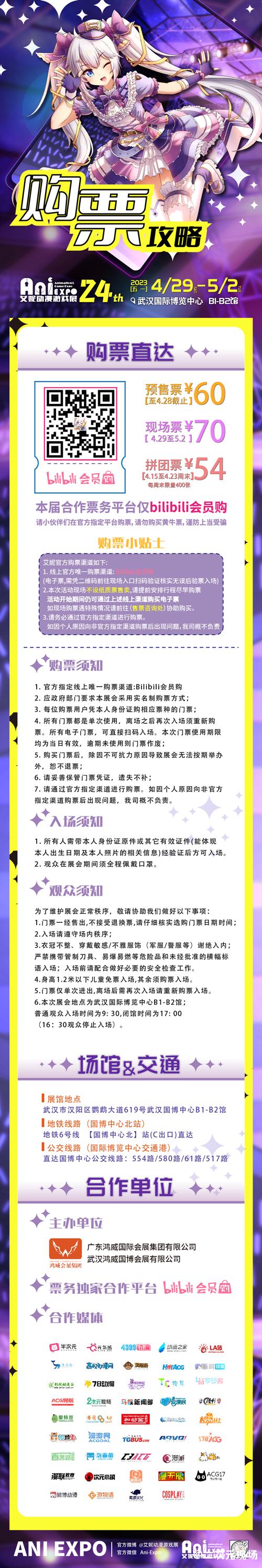 Part 09 购票攻略拼团票:54元【至4月23日截至】* 每周末限量发售,不快人一步可能就售罄了哦预售票:60元【至4月28日截至】 现场票:70元【4月29日-5月2日】 官方指定独家购票平台:哔哩哔哩会员购小伙伴们赶紧右键码住,扫码购票吧!������请认准官方购票渠道,切勿购买黄牛票哦~
