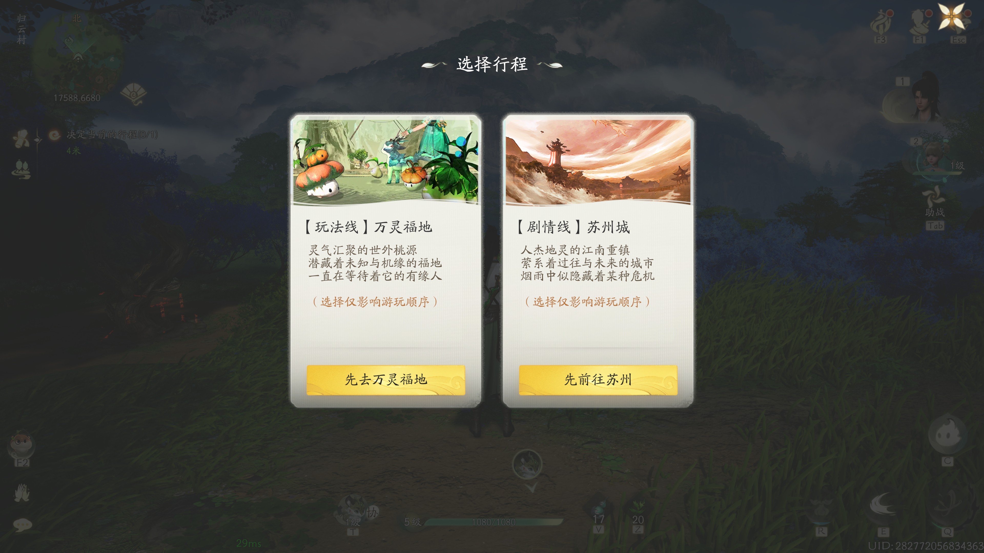 事实上,游戏主动调整了传统RPG的“主线”概念:迈出新手村时,玩家可以自主选择“玩法线”或“剧情线”,以便优先体验对应内容。前者可以优先体验御灵系统和家园玩法,后者则是先一步参与苏州城主线任务。