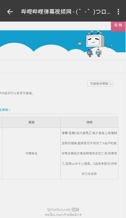 在边看春晚变刷微博的时候发现,很多用户在微博上说自己的“节操值”被扣历史有上写着说明是“我是b站内部员工 除夕夜被上级强制加班并威胁,我实在忍无可忍了 b站平时就经常恶意拖欠拿各种理由克扣工资,侮辱员工,出卖up主个人信息。b站虽未倒闭,但绝对已经变质”。根据B站站长9bishi的微博消息,应该是有其他公司ddos攻击,还偷了管理员账号。