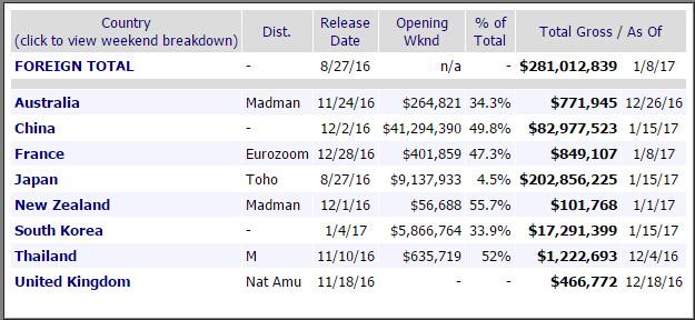 尽管在最近的奥斯卡最佳动画提名中,《你的名字》并没有入选其中,但它的票房还是依旧很好的证明了这部电影的成功。根据美国电影发行信息网BOX OFFICE MOJO统计,电影《你的名字。》全球票房已达2.81亿美元(约合318亿日元),超越《千与千寻》2.75亿美元(约合311亿日元)的纪录,成为影史全球票房最高的日本电影。《你的名字》能登顶全球票房最高日本电影,海外市场贡献巨大,其中中国大陆占比最高。